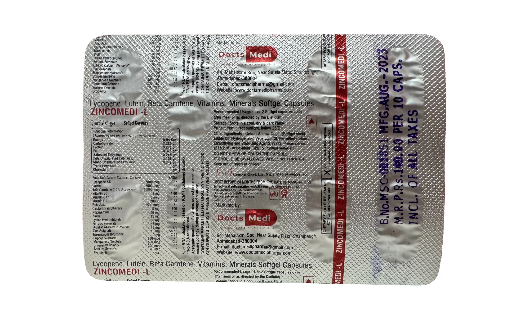 ZINCOMEDI-L Tablets are specially formulated softgel capsules that deliver a powerful blend of Lycopene, Lutein, Beta Carotene, Essential Vitamins, and Minerals to support overall health and well-being. Designed for individuals with high nutritional demands, these capsules provide a comprehensive solution to boost immunity, enhance energy, and promote optimal body function.
